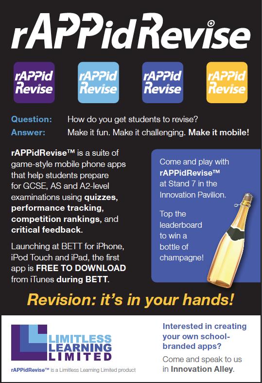 If you’re going to be at BETT, please come and visit us at stand 007 in Innovation Alley. Play with our app and top our rAPPidRevise BETT leaderboard to win a bottle of champagne!
